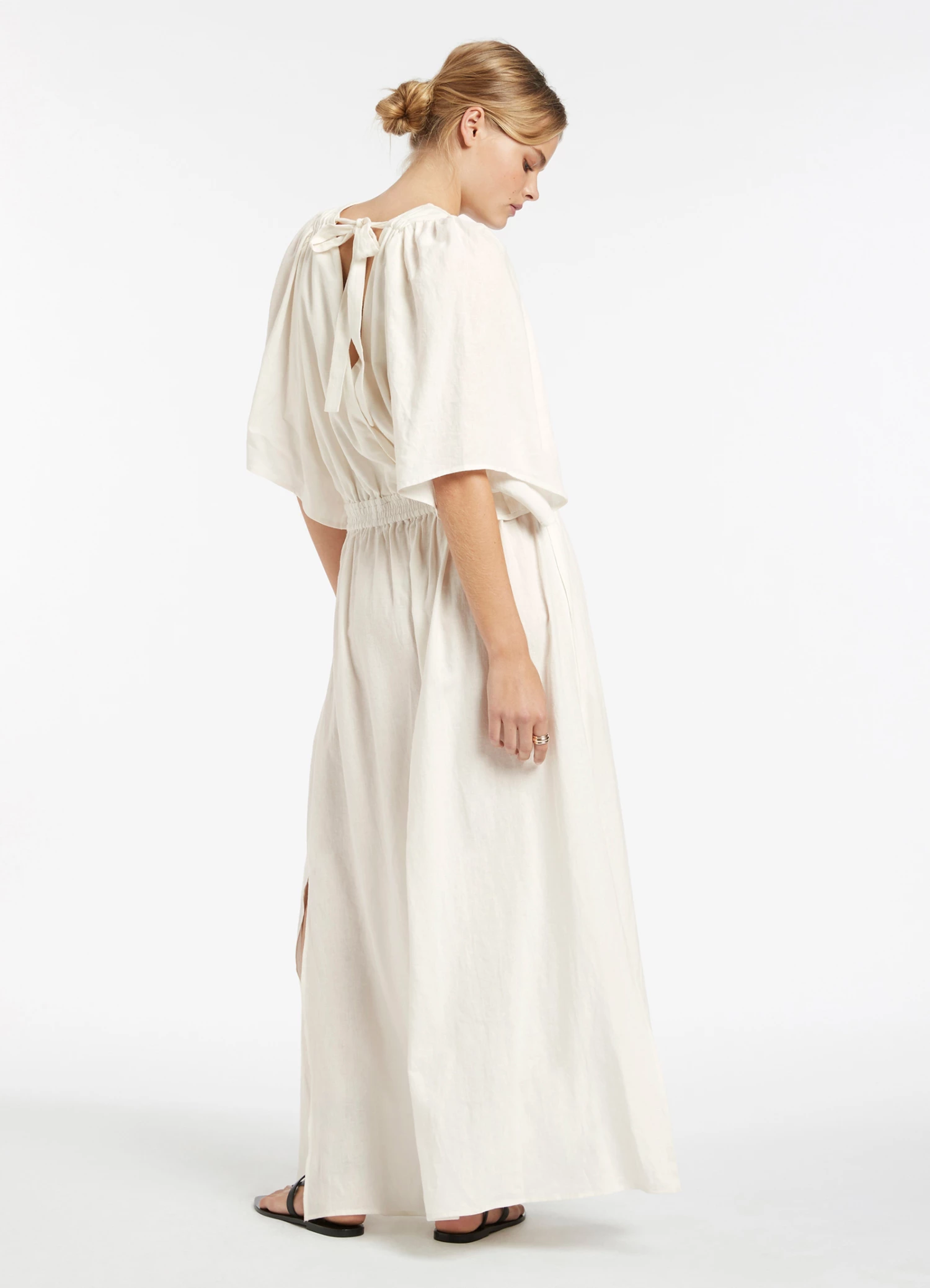 The Bonita Full Sleeve Dress combines form-fitting shape with a contemporary waistline. Designed with a soft viscose and linen blend fabrication and complete with wide sleeves, a v neckline and side splits, this elevated dress provides a flattering addition to your resort wear wardrobe.
