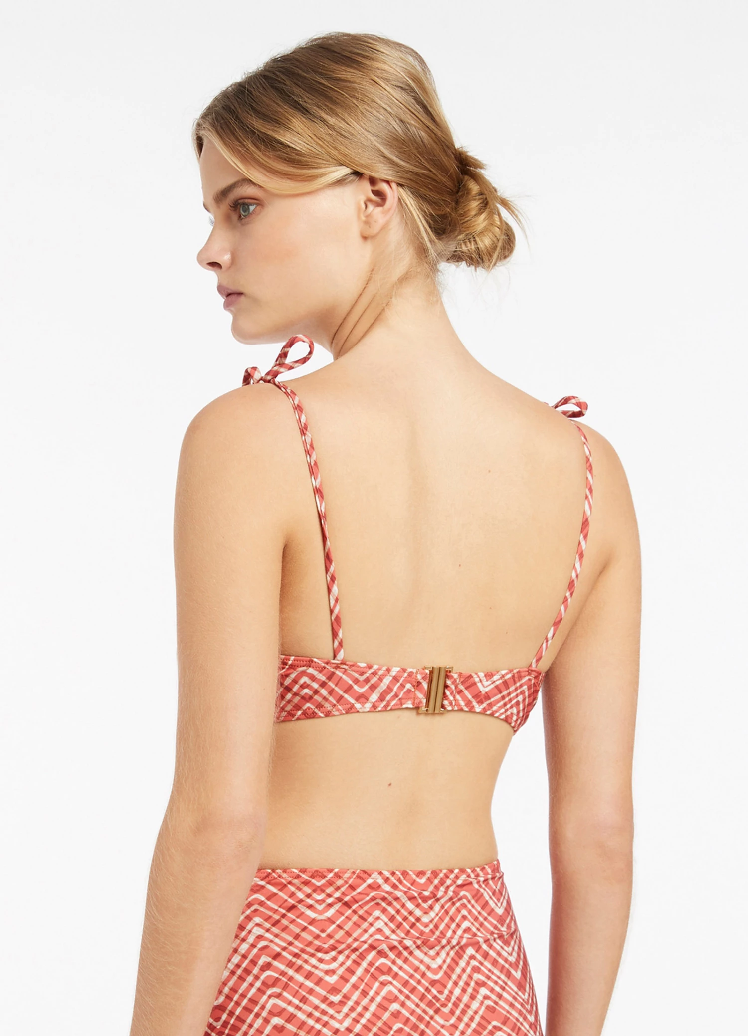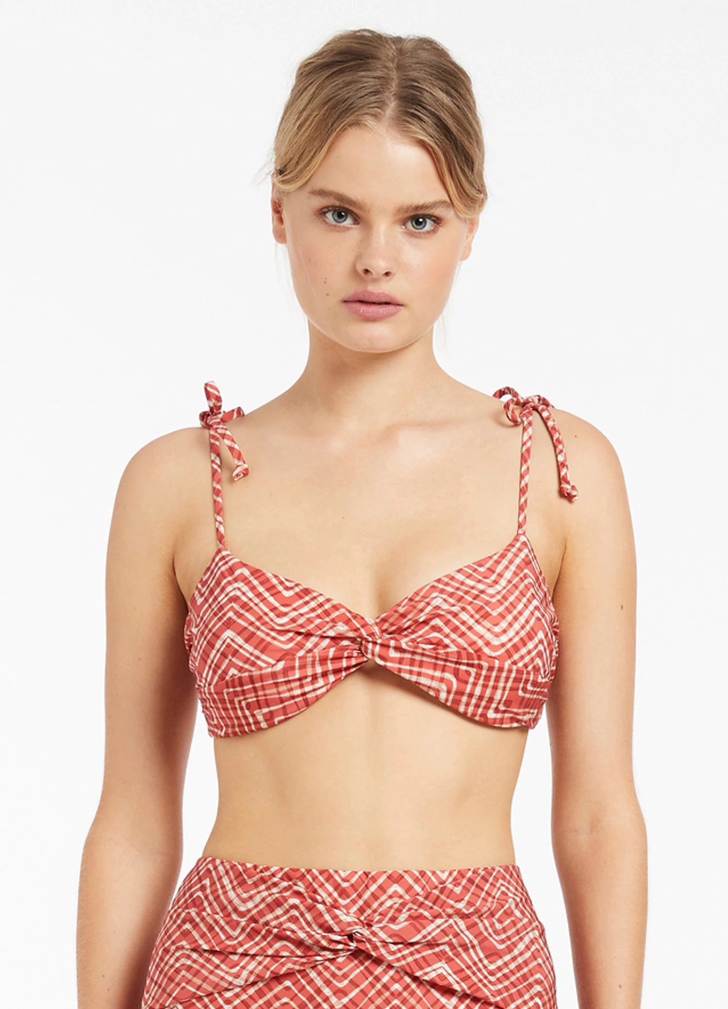The Bonita Twist Front Bikini Top is an elevated design with tie straps and a back-clip closure for a form-fitting adjustable swim silhouette. Complete with a twist front detail and feminine geometric print, this elevated bikini top provides a flattering shape for your swim wardrobe.
