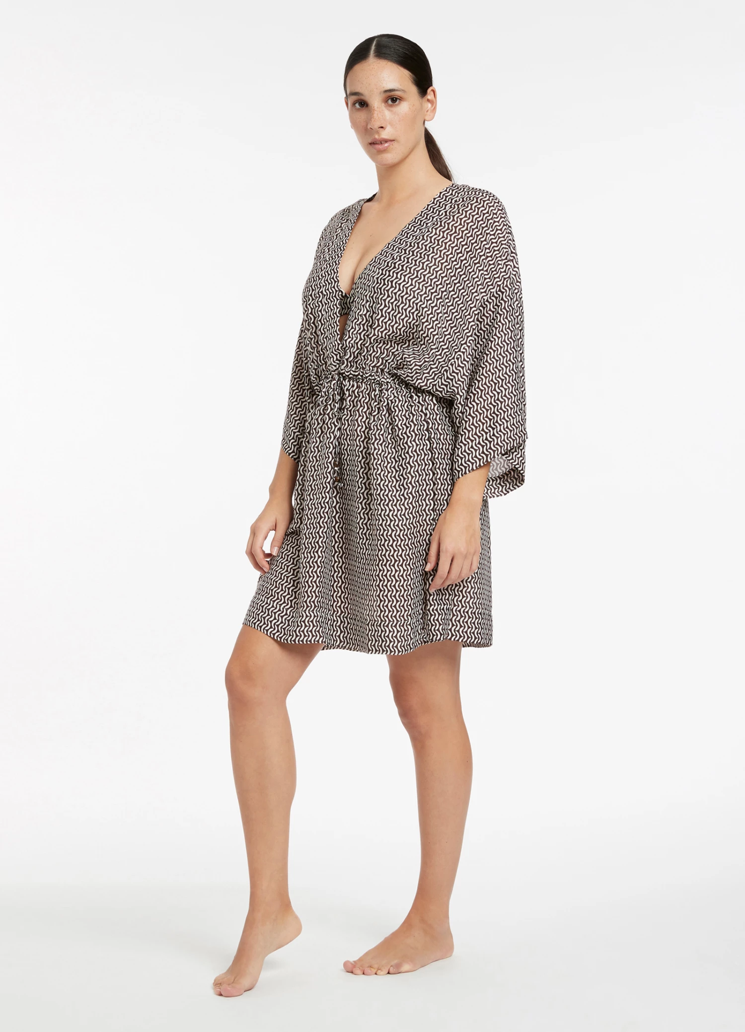 The Ipanema Gathered Front Kaftan combines classic shape with contemporary geometric print detailing. This elevated wide sleeve beach kaftan featuring side splits and an adjustable waist tie crafts a flattering silhouette style for your summer wardrobe.