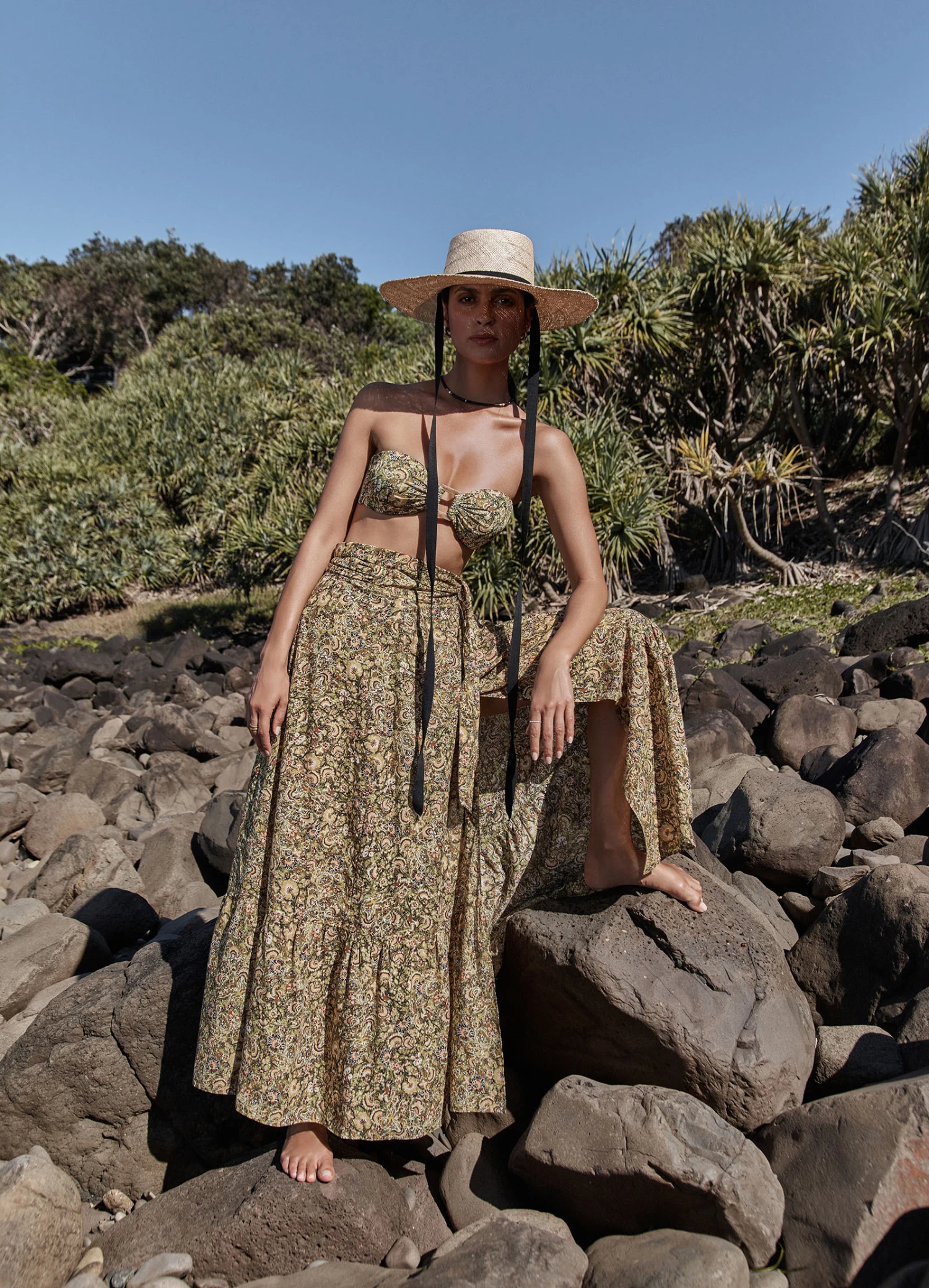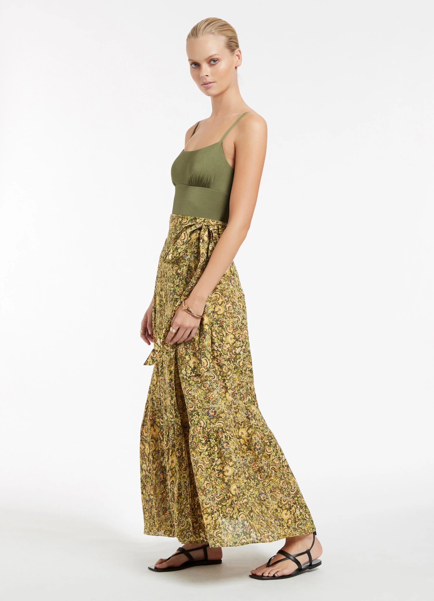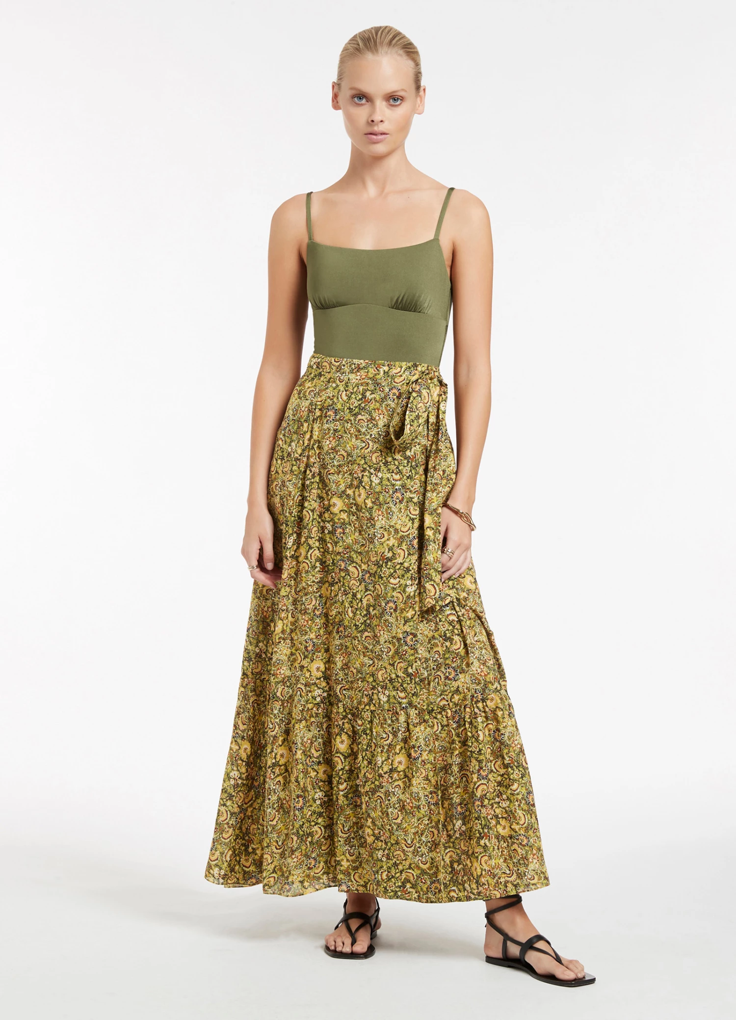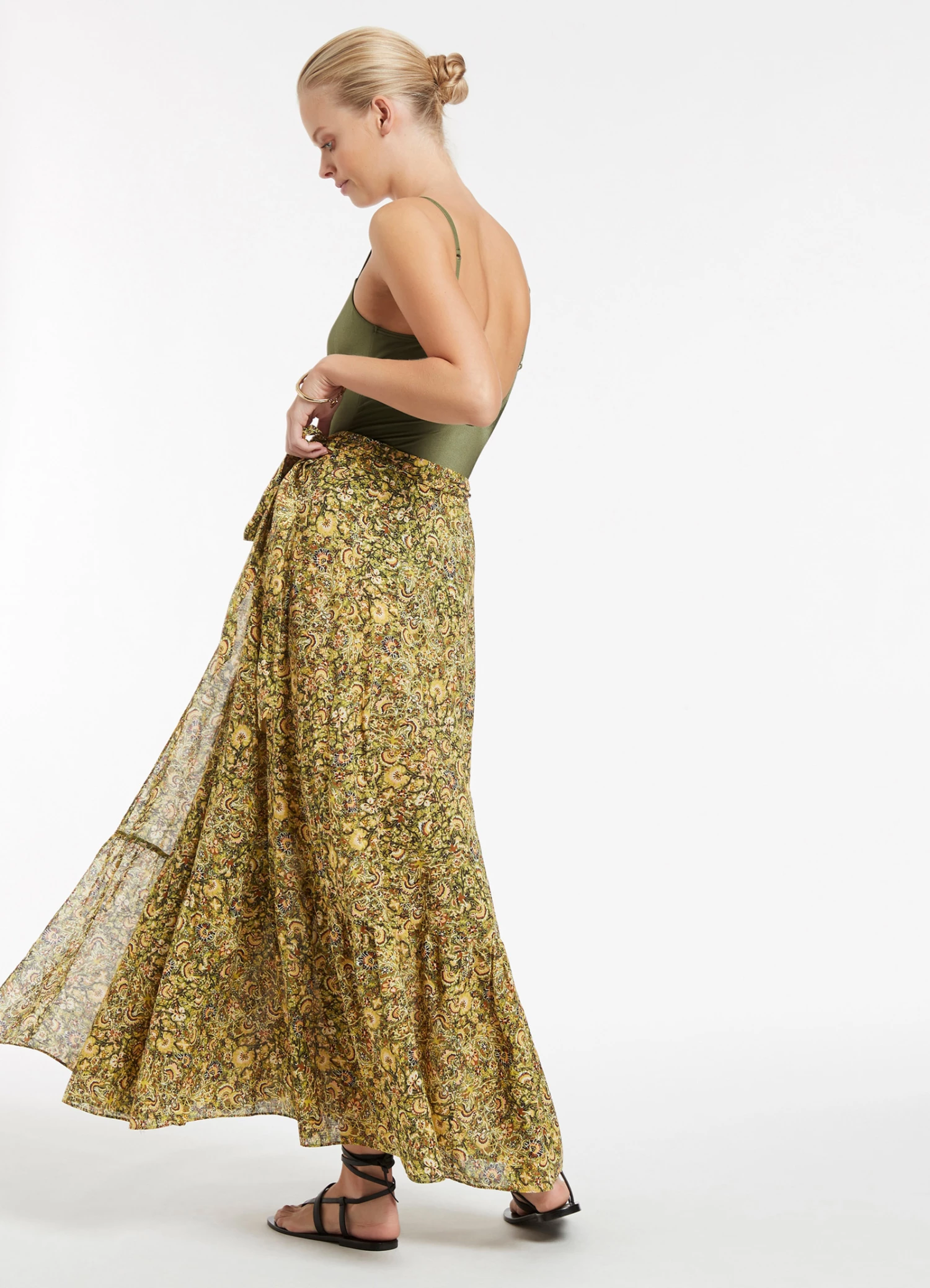 The Majorelle Maxi Wrap Front Skirt is fashioned from pure cotton for an effortless lightweight feel. This wrap front maxi skirt features a soft ruffle hem and tie-up bow at the waist for feminine detailing.