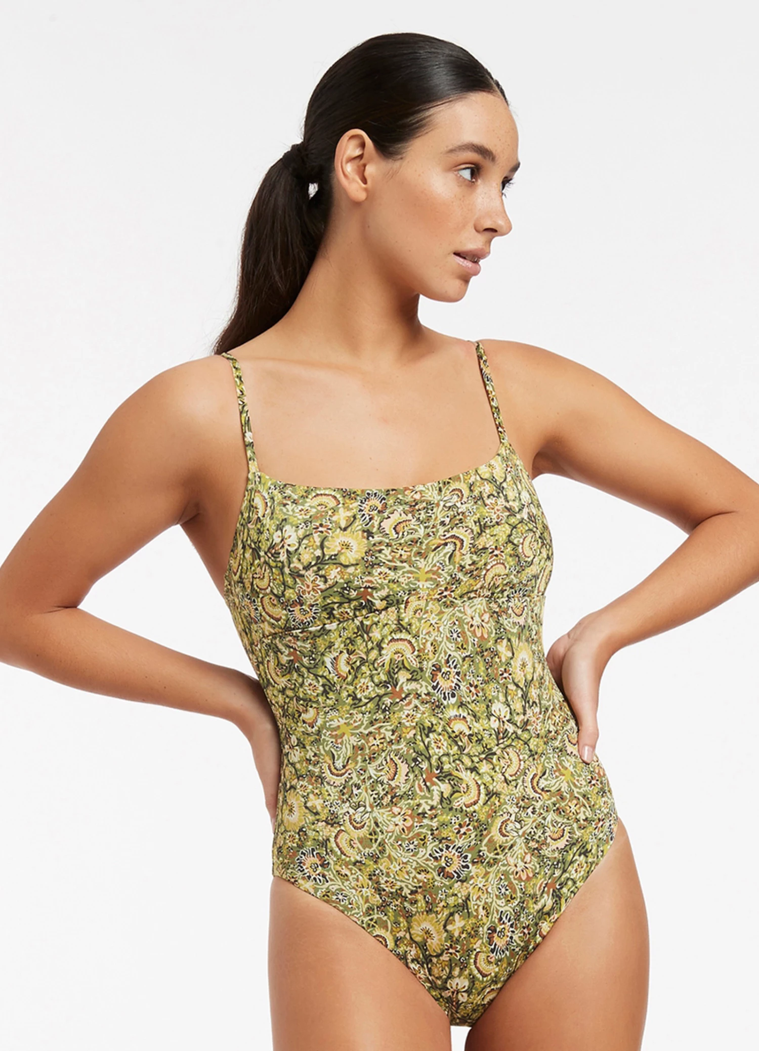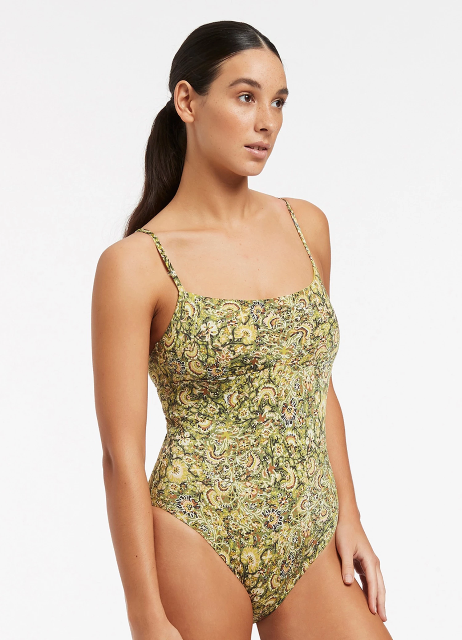 The Majorelle Tank One Piece Swimsuit comprises classic shape with delicate shoe string straps. This seamless design complements your figure, fitted with comfortable shelf bra and removable soft cups for shape and support.