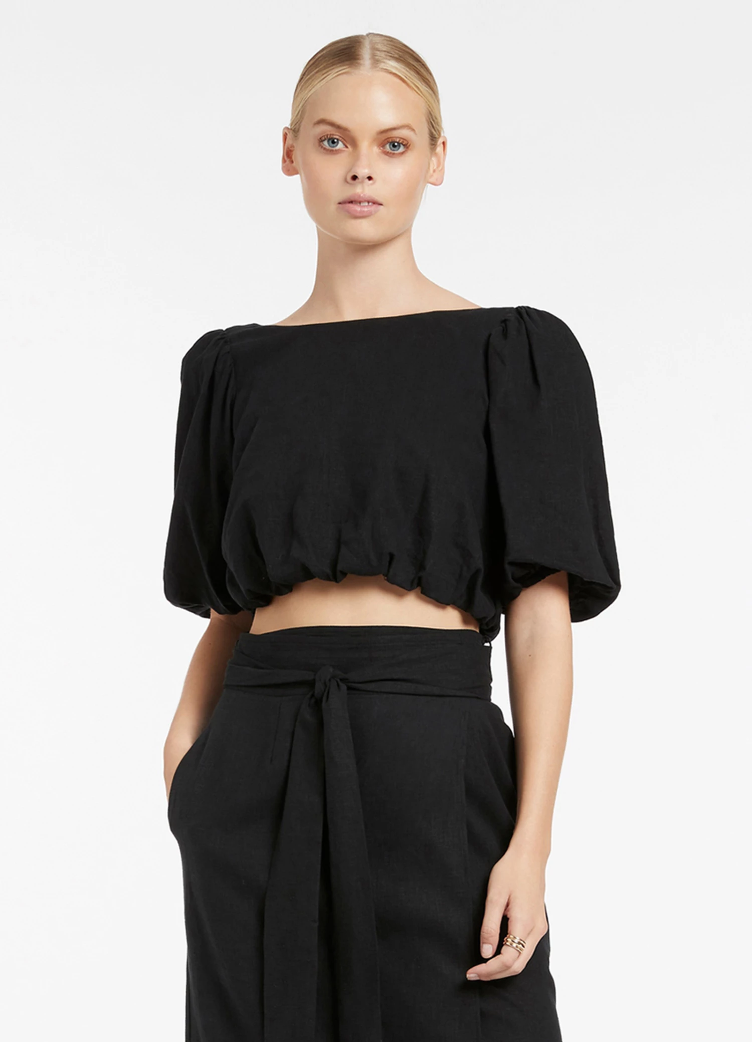 The Palmas Puff Sleeve Top is a classic cropped hem style crafted from a soft-to-touch linen viscose blend. The puff sleeves and simplistic design adorns the gathered waistband to complete the feminine silhouette.