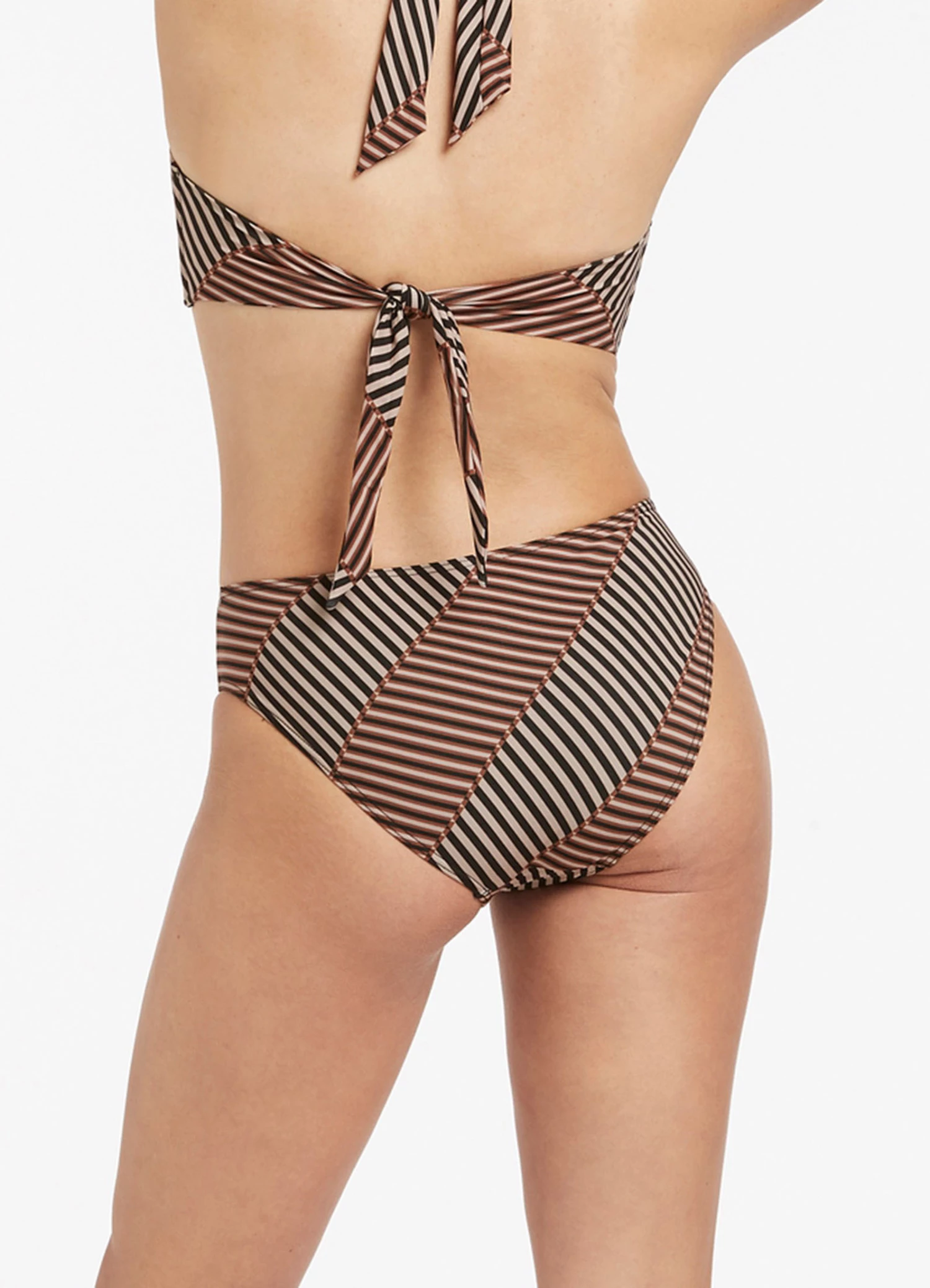 The Raya U Trim Mid Bikini Bottom combines mid rise styling with a contemporary design. The gold look side detailing elevates the bikini bottom to form a flattering mid rise style perfect for warm weather days.