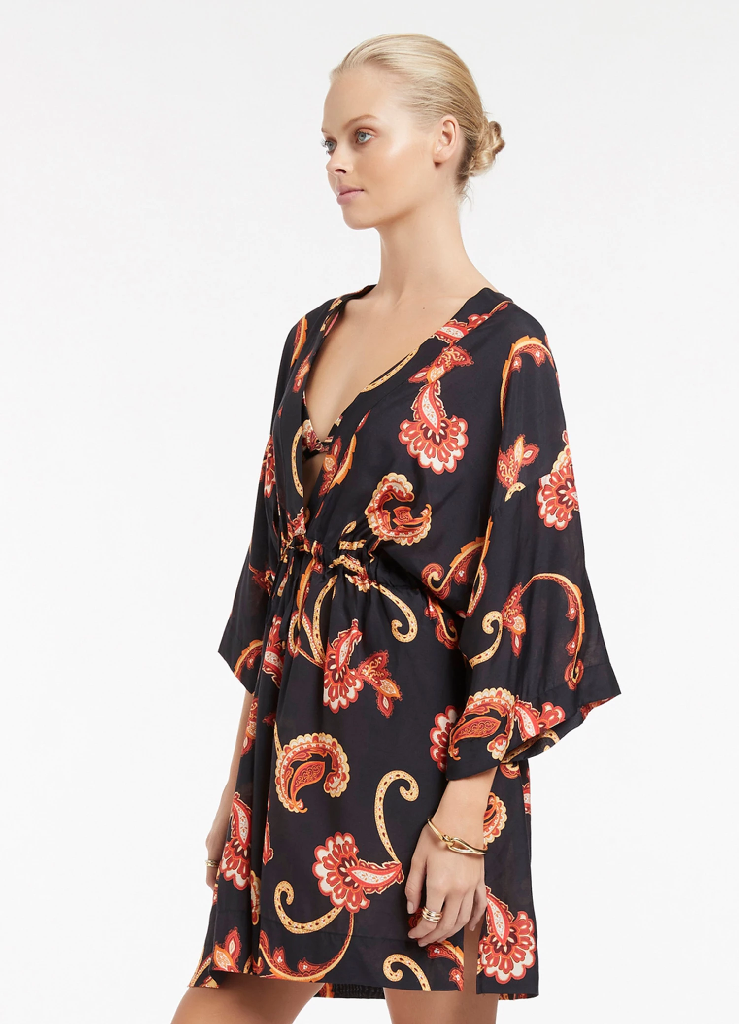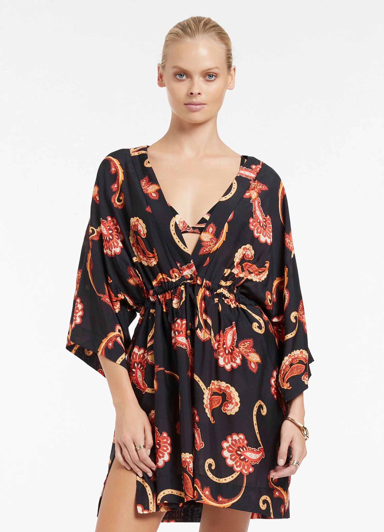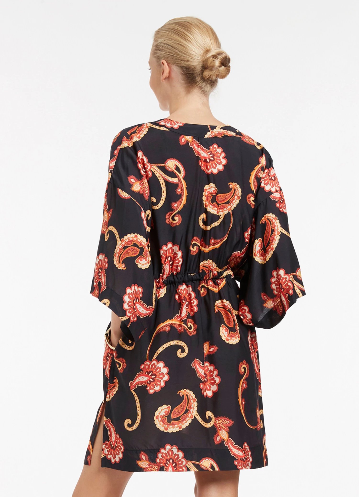 The Silk Road Wide Sleeve Kaftan is designed for relaxed luxury style, crafted from a smooth viscose-silk blend which offers a lightweight feel. A cinched adjustable tie waist, deep v-neck, wide bracelet sleeves and side splits provide the finer details.
