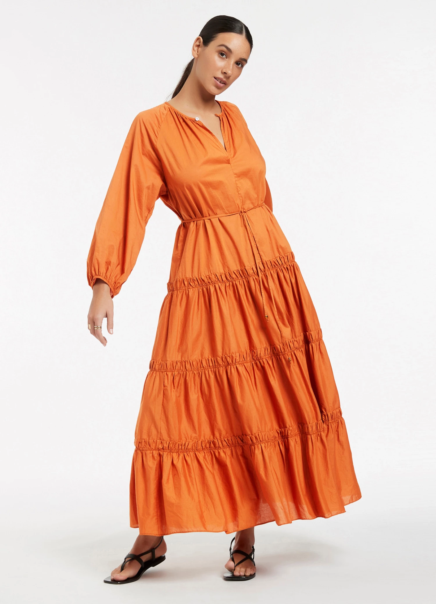 The JETSET Tiered Maxi Dress is crafted from crisp cotton-poplin with a soft to-touch composition. A tonal belt adorned with bead trim cinches the silhouette before graduating into a full hem skirt — the perfect warm weather maxi dress, designed for effortless luxe style.