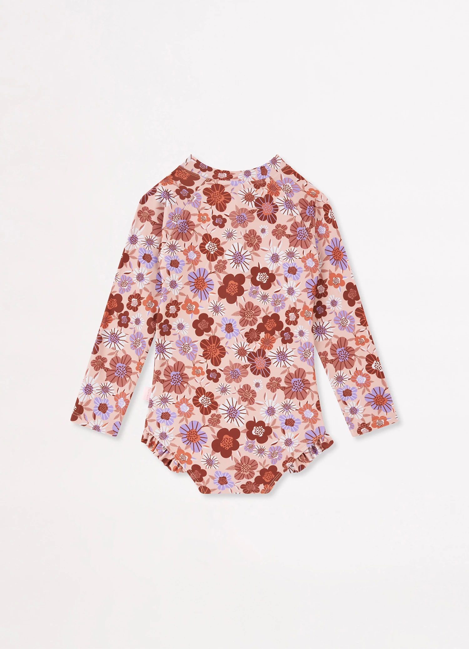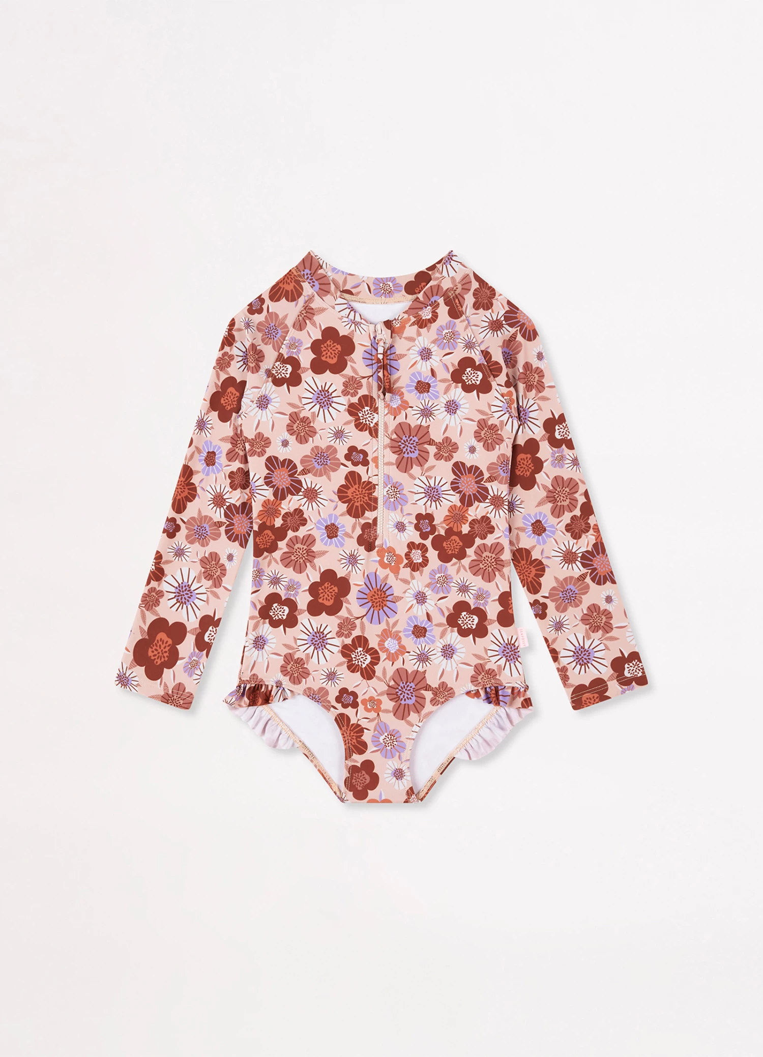 The Retro Longsleeve Ruffle Paddlesuit for girls is a full coverage protective surf suit with long sleeves and a zip front for an adjustable fit. This paddlesuit is complete with ruffles at the leg opening and a bold floral print.