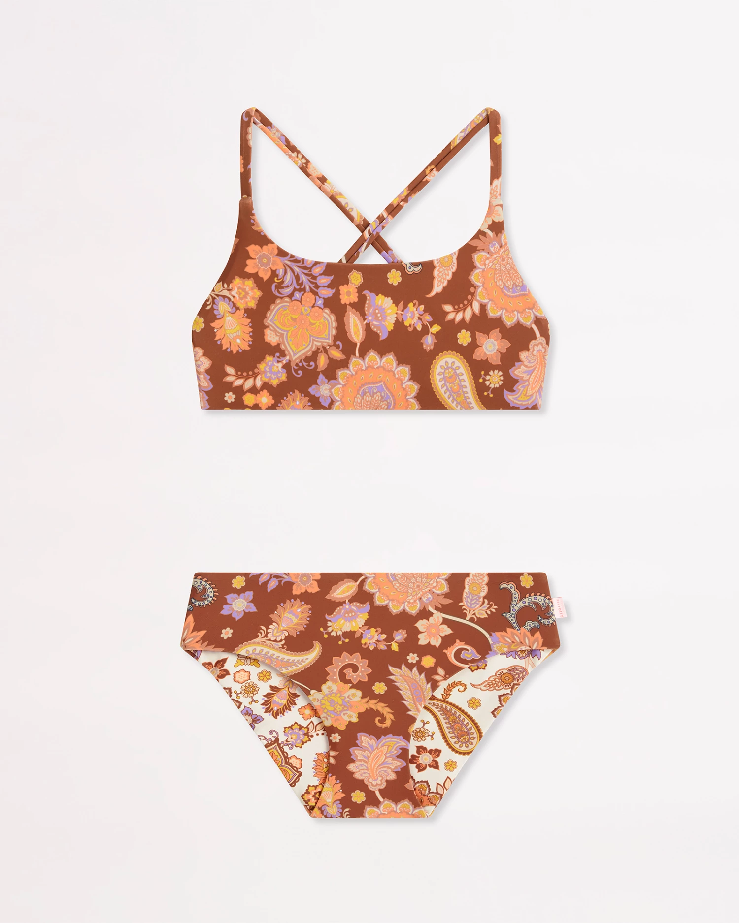 The Retro Reversible Bikini for girls is a versatile summer swimsuit for beach day activities. The adjustable crossover straps create a comfit fit, complete with a reversible paisley print.
