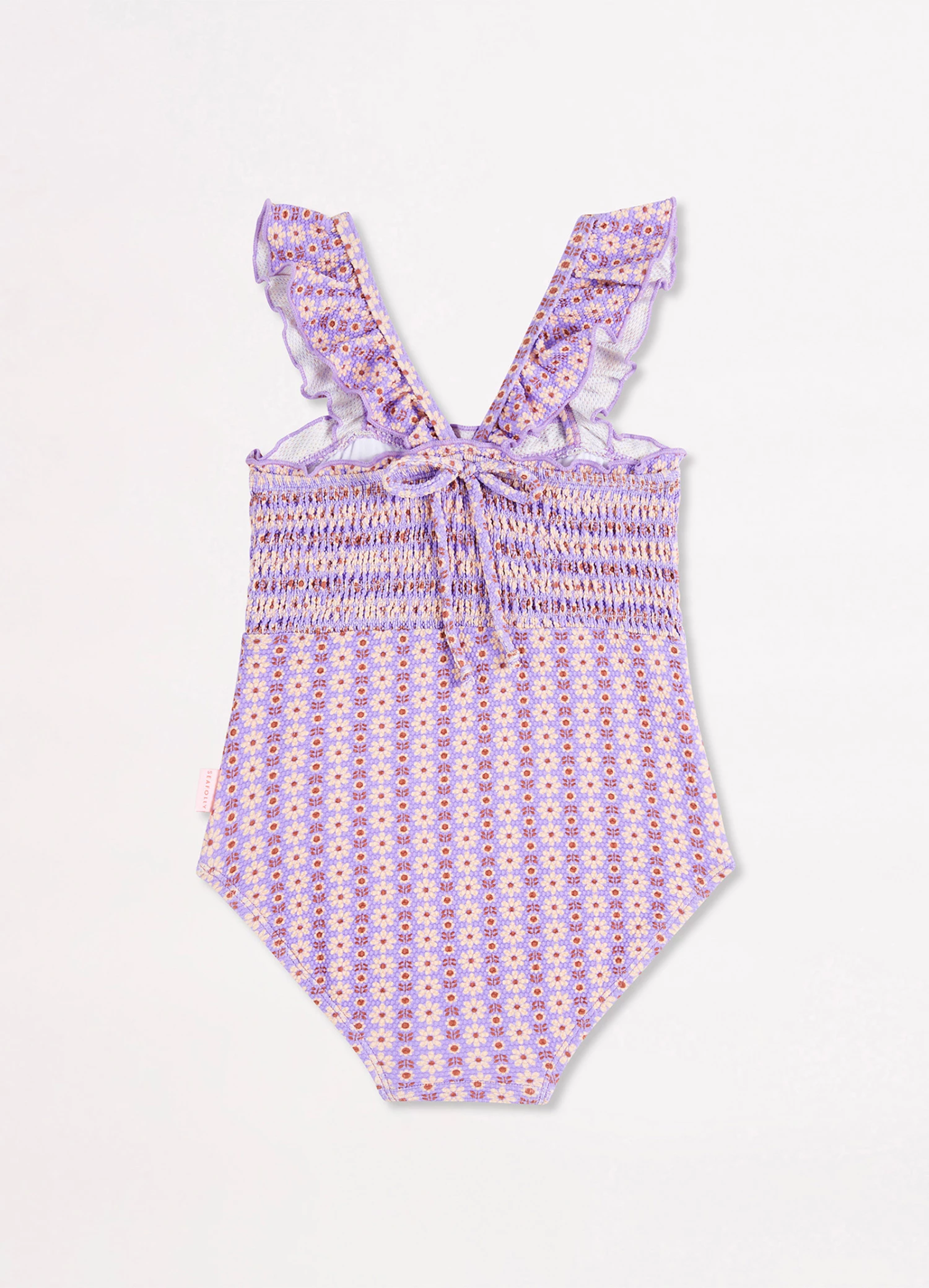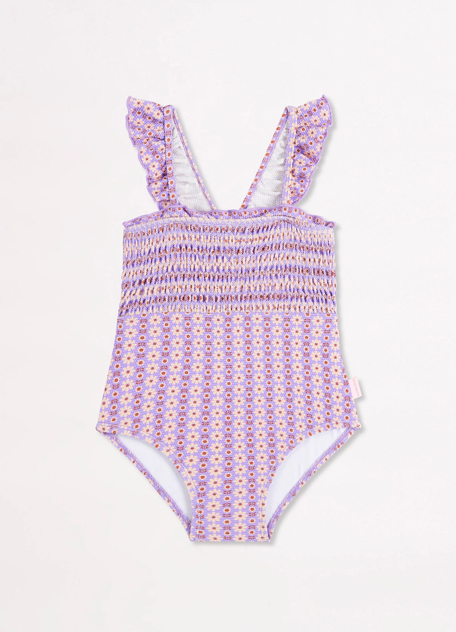 The Retro Shirred One Piece for girls is a simplistic swimsuit with ruffle straps and a ruffle top. Complete with straps that tie at the back, this one piece for girls is perfect for summer beach days.