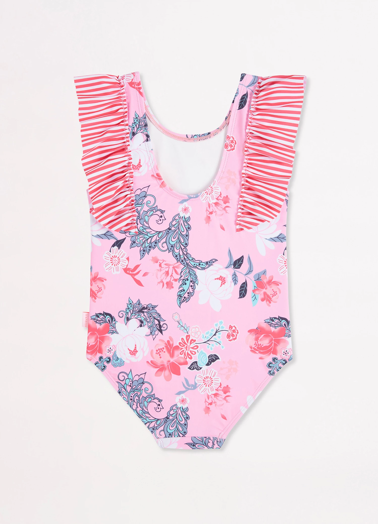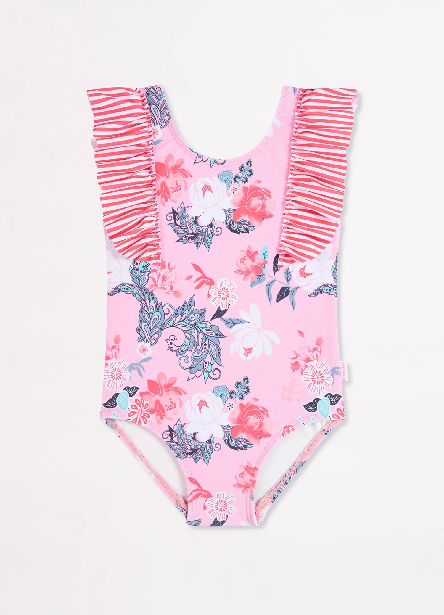 The Seafolly Summer Holiday Ruffle One Piece for girls is a vibrant summer print one piece, complete with frills.