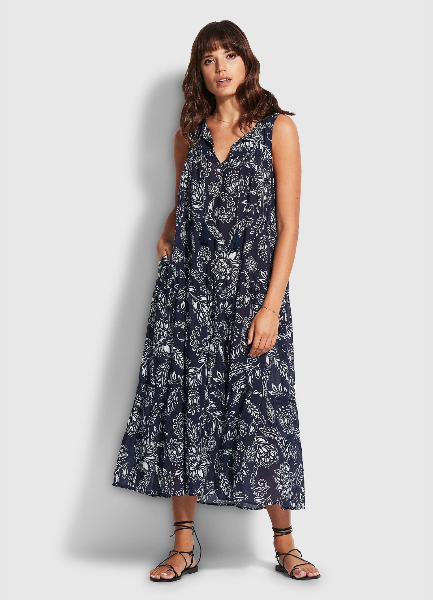 The Folklore Midi Dress is the perfect summer beach dress or cover-up. The classic tiered detailing with tassel detailed ties creates an effortless and weightless addition to your summer capsule wardrobe.