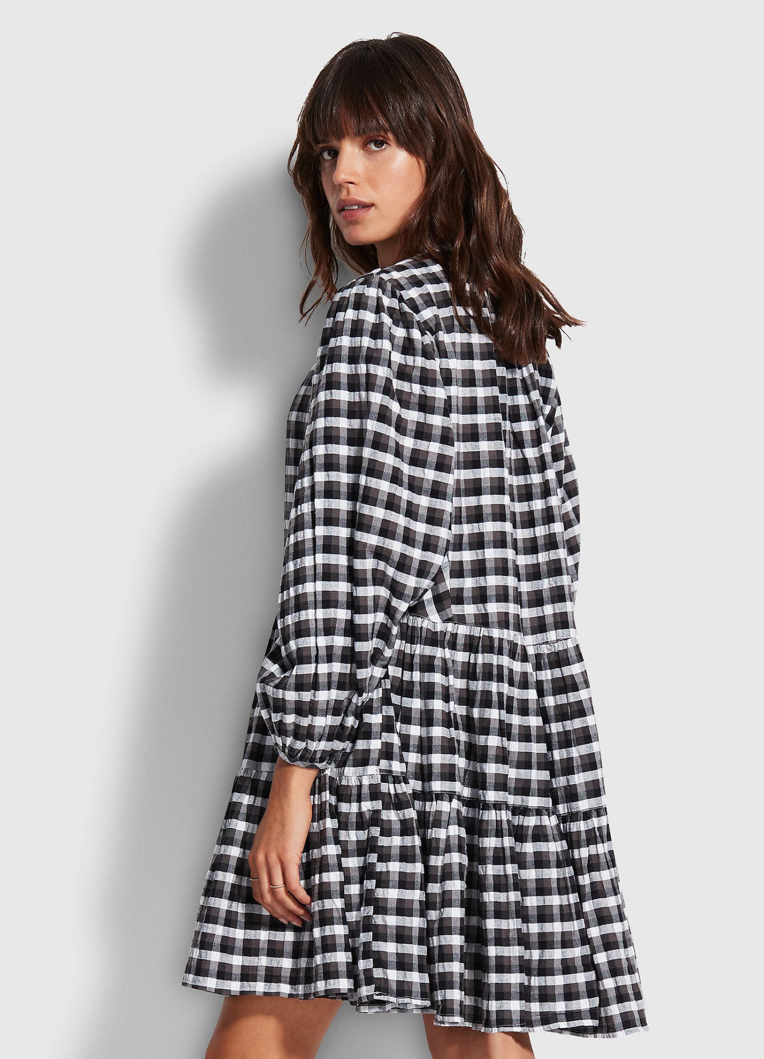 The Portofino Gingham Tier Dress is a flouncy beach dress featuring bell sleeves. The tiered detailing and tassel trim straps craft a must-have comfortable fitting overswim dress.