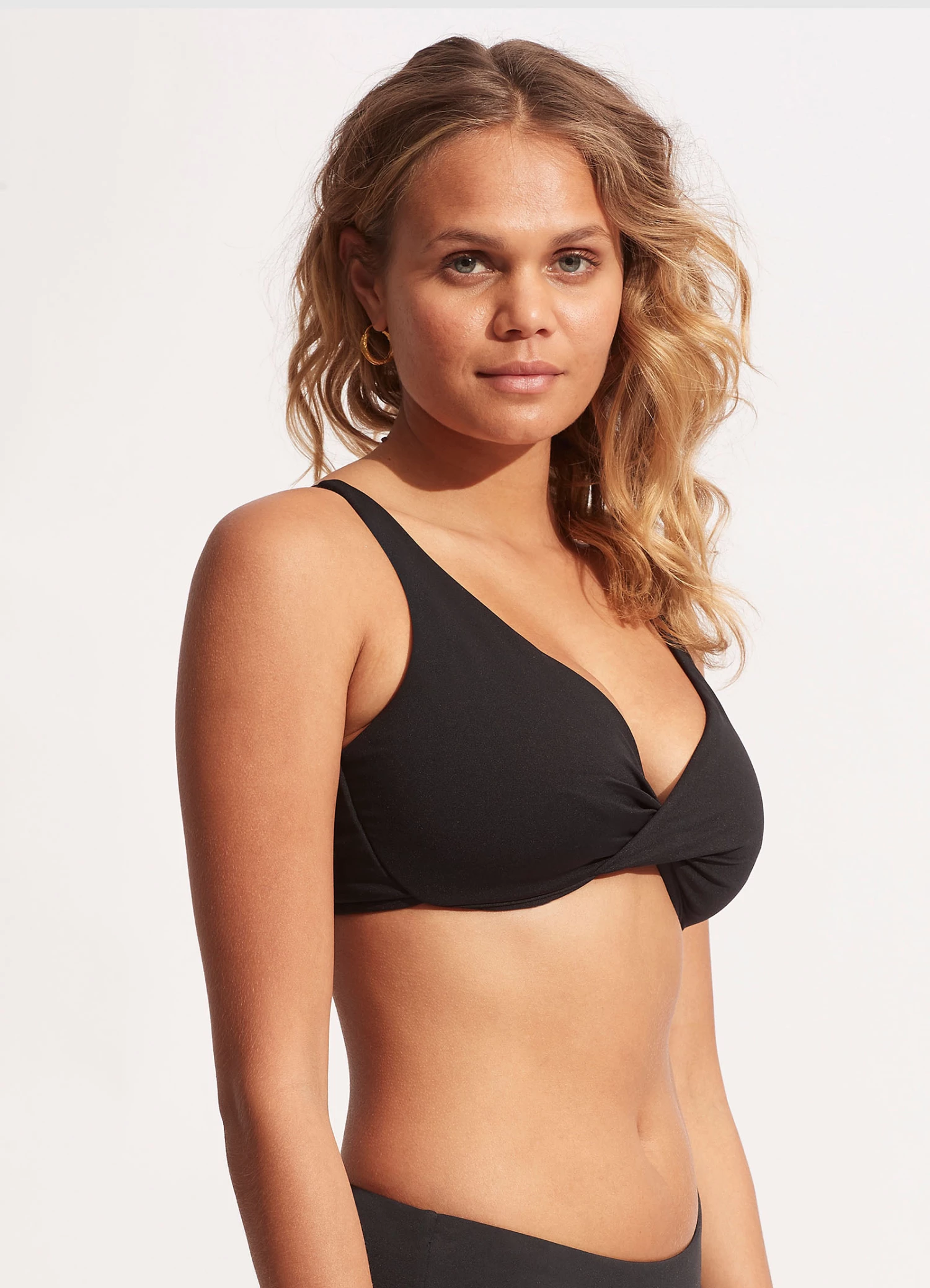 The Seafolly Collective Wrap Front F Cup Bra has adjustable cross back straps and supportive underwire. The wrap front detail on this bikini top provides extra coverage and completes the fuller cup beach look.