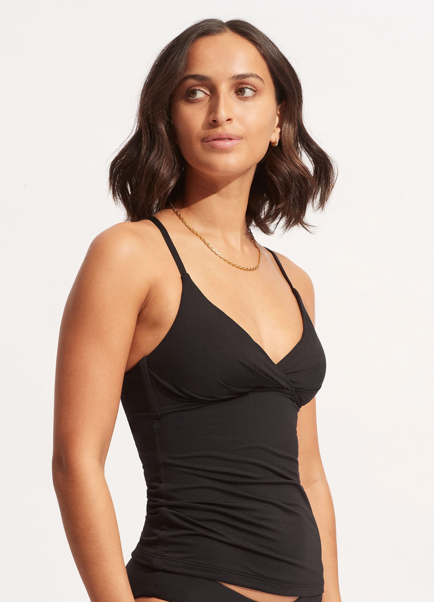 The Seafolly Collective Wrap Front Singlet Bikini Top is fitted for all-day comfort and support. This tankini style top features a flattering V-neckline as well as removable cups and adjustable straps so you can control the shape and fit of your swimwear.