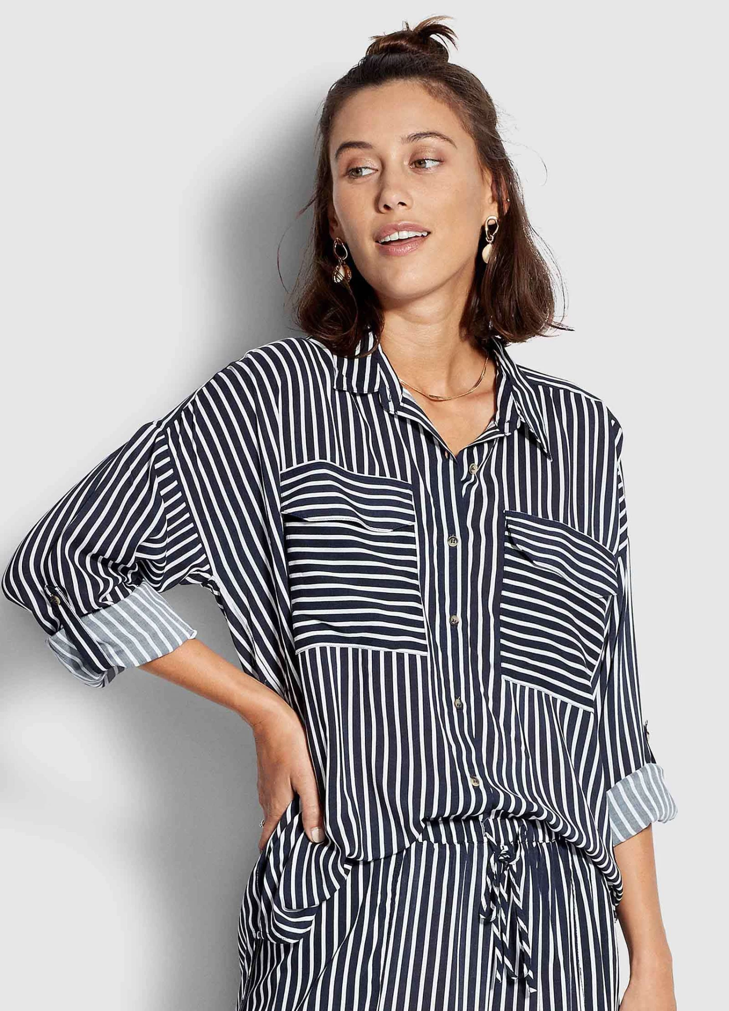 NAVY STRIPE COLOUR: Halcyon is wearing a size S garment. She usually wears an AU 8/S is 180cm tall, has a 78cm bust, 94cm hips and a 62cm waist.