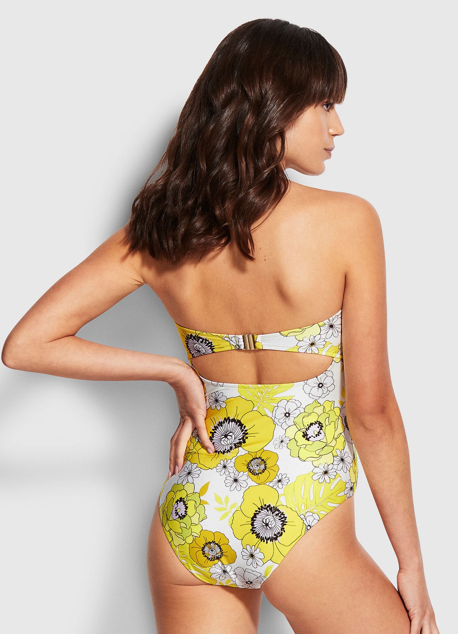 The Summer Of Love Ring Front One Piece is an elevated halter neck swimsuit with a metallic trim detail. The centre cut out, back-clip closure and removable straps craft a versatile one piece, complete with a placement floral print for a retro beach side look.