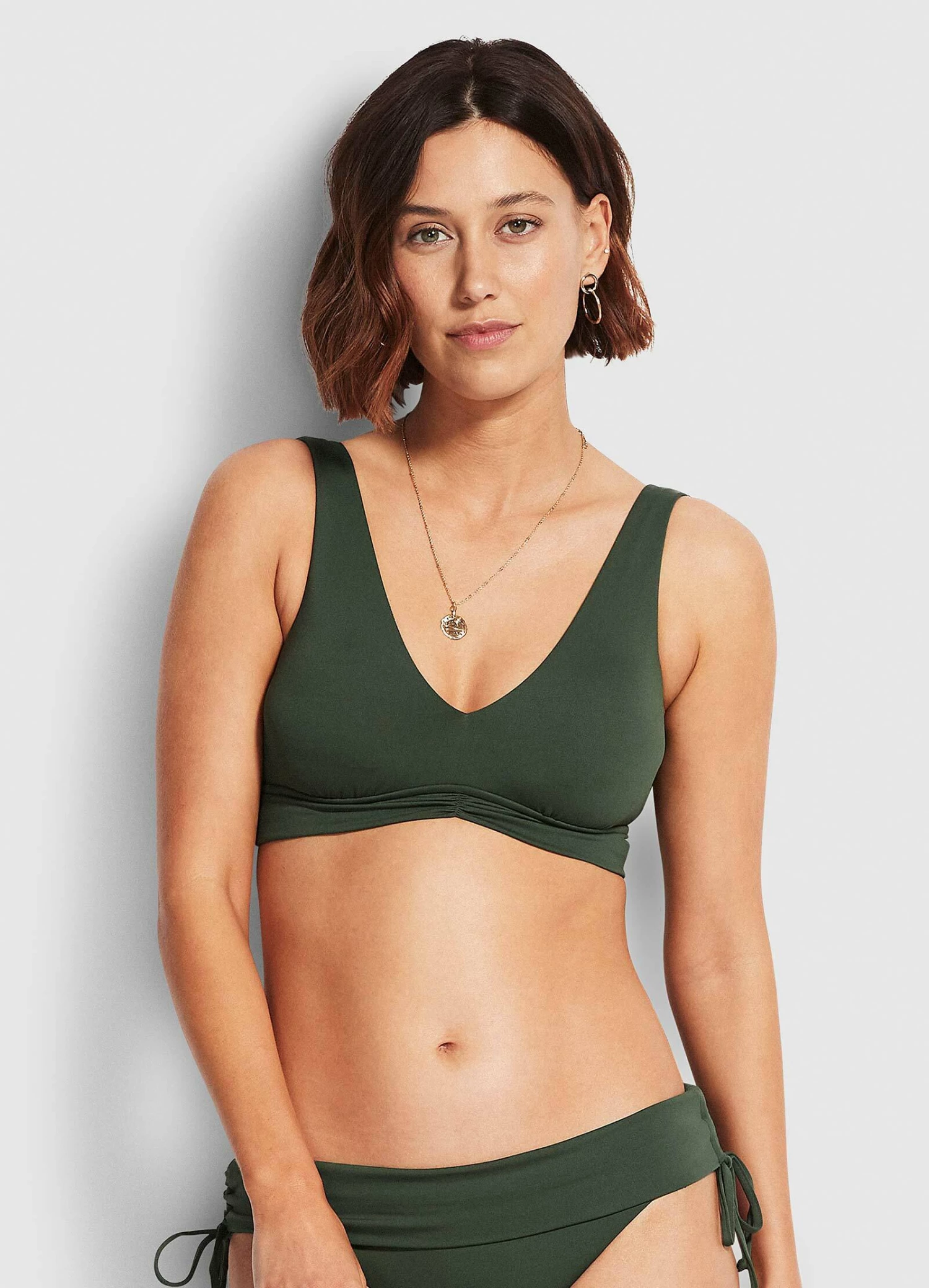 The Seafolly V neck Crop Bikini Top features removable cups and a ruched band to offer added shape and support around the bust. This classic brallette bikini top is a swimwear staple suitable for a range of cup sizes.